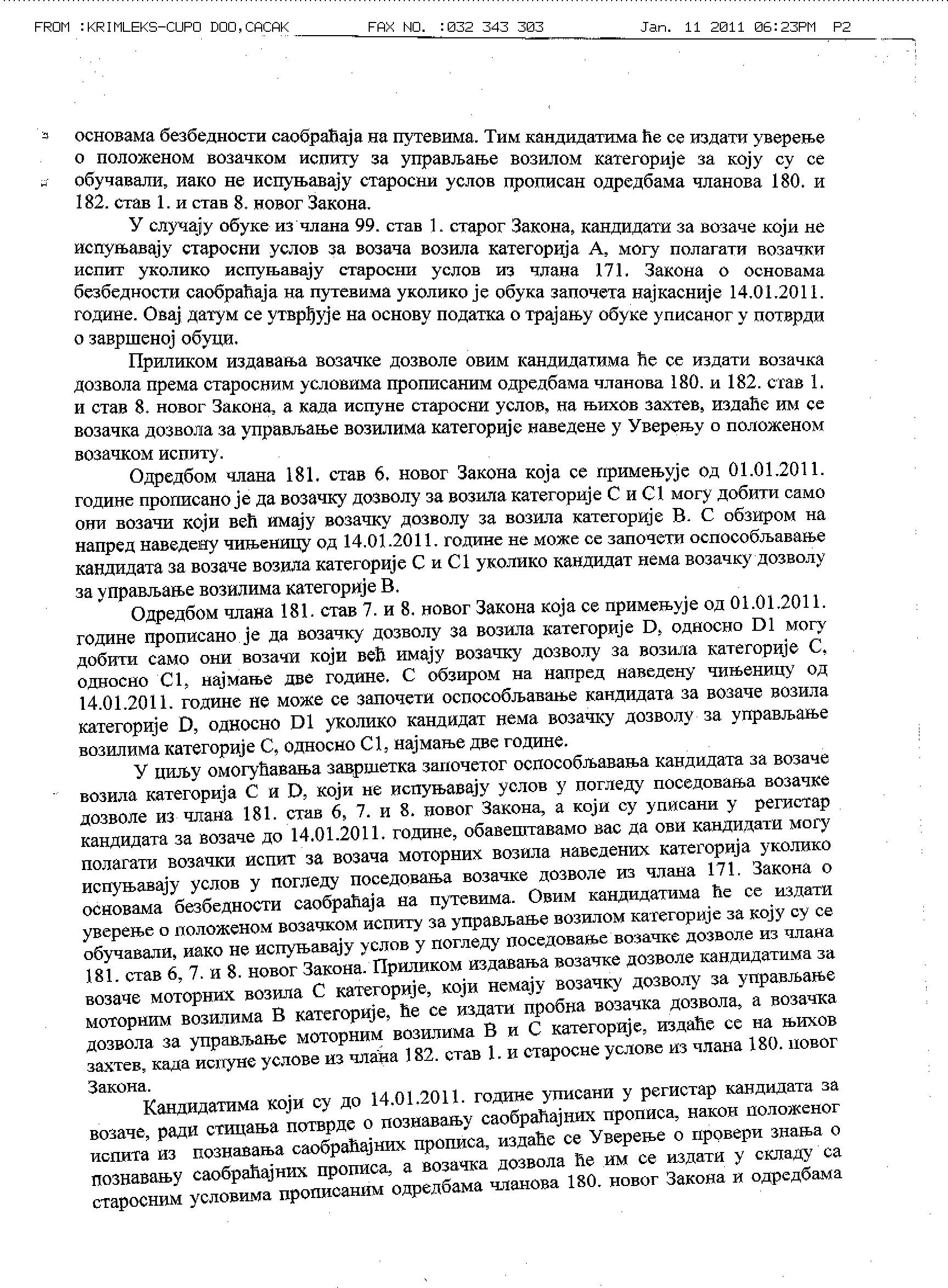 Zahvaljujem se na odgovoru...uzgred bio sam juče u MUP, u Ljermontovoj, i rekli su mi da ne može da se upisuje ništa u staru dozvolu, iako je važeća, zbog stupanja na snagu novog  Pravilnika. Što se tiče D kategorije (nemam staža za C kategoriju 2 godine), nisu mogli da mi odgovore da li je to smetnja za upisivanje kada budem položio. Uglavnom, može se polagati po starom sistemu obuke, ko se prijavio do 14.janura.